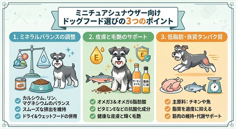 原材料表示やメーカー公開情報などの一次情報を確認し、ミニチュアシュナウザーで留意したい尿路・皮膚・脂質の観点に配慮して選定しています。広告の有無に関わらず、主原料・たんぱく/脂質比・ミネラル設計・添加物の基準に沿って公正に記載します。